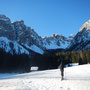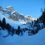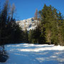 Der Startpunkt unserer Skitour liegt in Campill, ein Weiler, der zu St. Martin in Thurn gehört, am Parkplatz bei einer Holzbrücke in Richtung Juwel. Schon die Anfahrt ist hier beeindruckend - man fährt an den bekannten Viles vorbei. Von hier aus folgen wir dem Sommerweg Nr. 9 in südliche Richtung durch den Wald. Wir folgen der Beschilderung „Zwischenkofel - Antersasc - Puez“, welche uns quer in das Tal hinein führt.